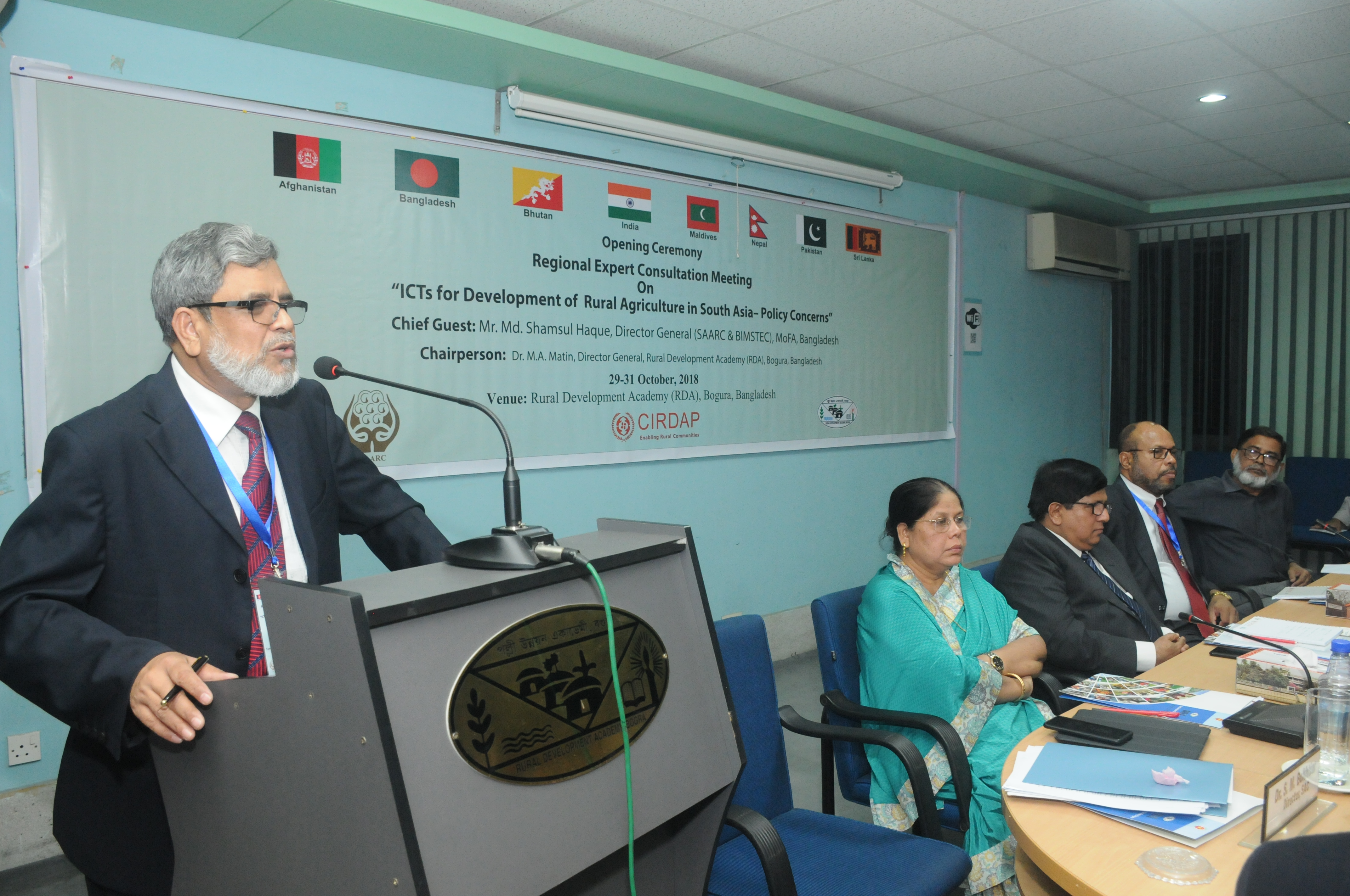 The SAARC Regional Expert Consultation meeting on “ICTs for Development of Rural Agriculture in South Asia – Policy Concerns” was conducted at Rural Development Academy (RDA), Bogura, Bangladesh on 29-31 October 2018 subsequent to the approval of 11th SAC GB and 54th PC, SAARC Agriculture Centre. The expert consultation meeting was jointly organized by the SAARC Agriculture Centre (SAC), Dhaka, Bangladesh and Centre on Integrated Rural Development for Asia and the Pacific (CIRDAP), Rural Development Academy (RDA) with objectives;