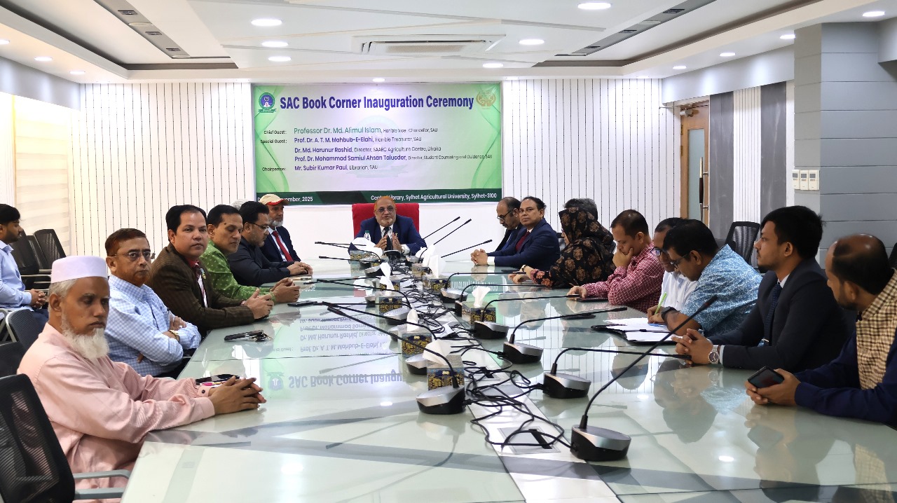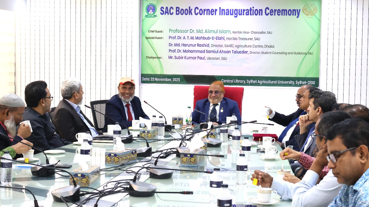 SAARC Agriculture Centre (SAC) has inaugurated SAC Book Corner at the Sylhet Agricultural University (SAU) central Library on Saturday (22 November 2025). The Book Corner aims to strengthen academic resources and promote regional agricultural knowledge among students, researchers and faculty members. Following the inauguration, a discussion session was held between representatives of SAC and SAU.