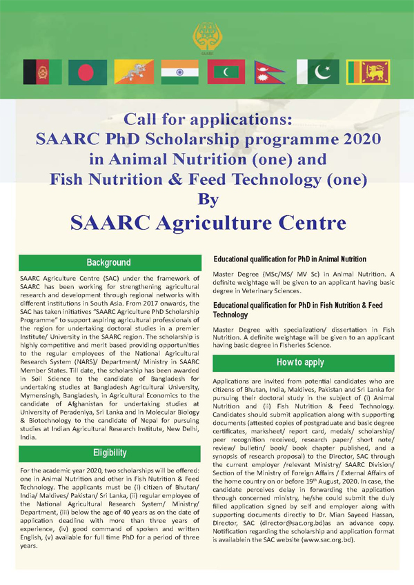 SAARC Agriculture Centre (SAC) under the framework of SAARC has been working for strengthening agricultural research and development through regional networks of different institutions in South Asia. From 2017 onwards, the SAC has taken initiatives “SAARC Agriculture PhD Scholarship Programme” to support aspiring agricultural professionals of the region undertaking doctoral studies in a premier Institute / University in the SAARC region. The scholarship is highly competitive and merit based providing opportunities to the regular employees of the National Agricultural Research and Extension System (NARES) / Department / Ministry in SAARC Member States.