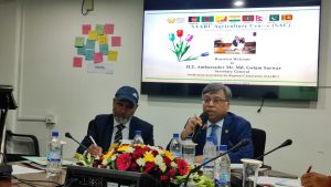A comprehensive presentation focuses on regional integrations, particularly in sectors like food security, climate resilience, and regional policy was given by the Director, SAC where H.E. Ambassador Mr. Md. Golam Sarwar, Secretary General of SAARC was the Chief Guest. Mr. Hari Prasad Odari Director (Poverty Alleviation and Information), SAARC Secretariat and Mr. Md. Arafat Rahman, Director (SAARC and BIMSTEC) were present as guests.